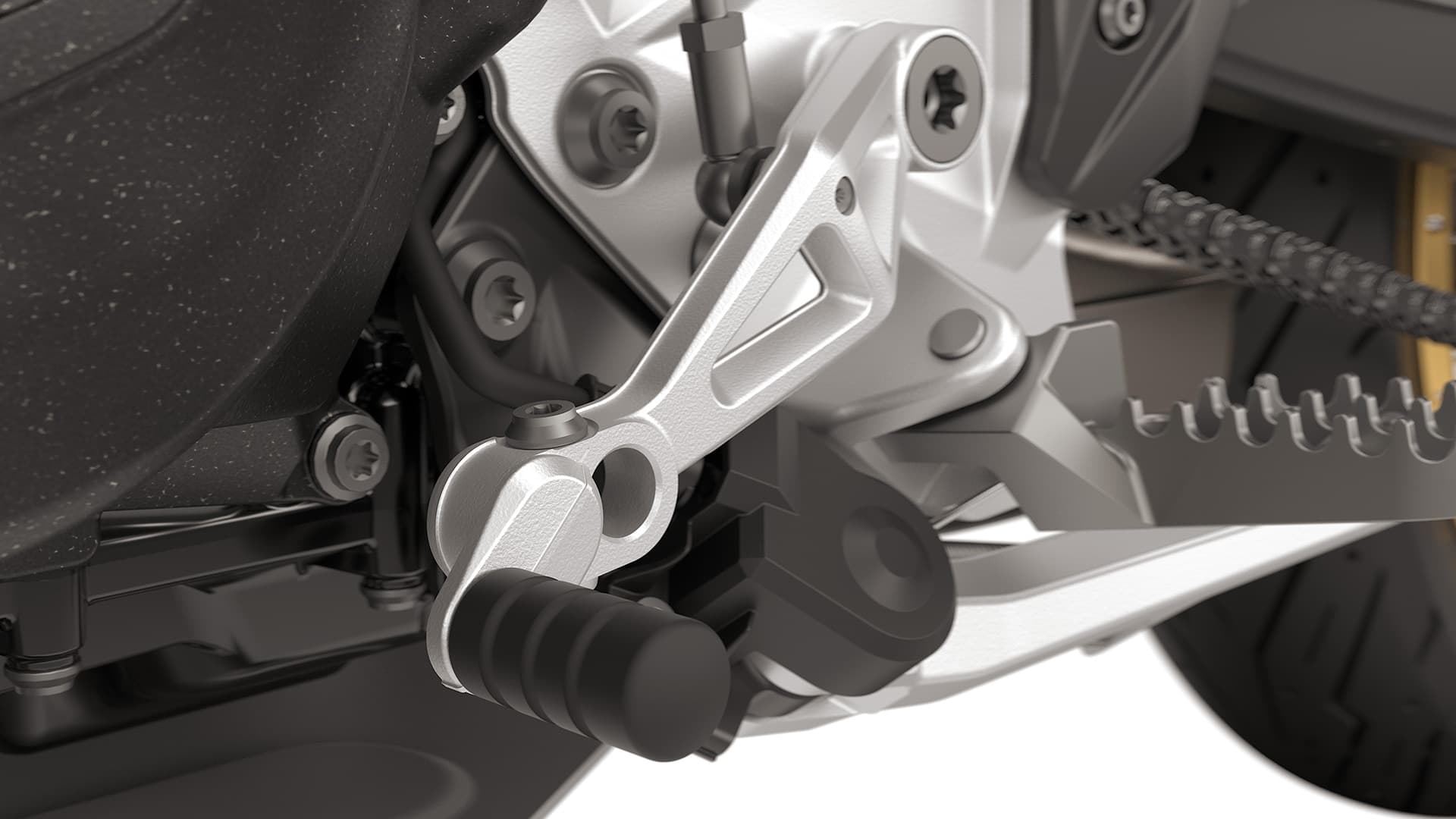 Encuentra la posición perfecta para ti con el pedal del cambio y maneta del freno ajustable incluido de serie en la F 900 GS de BMW Motorrad.
