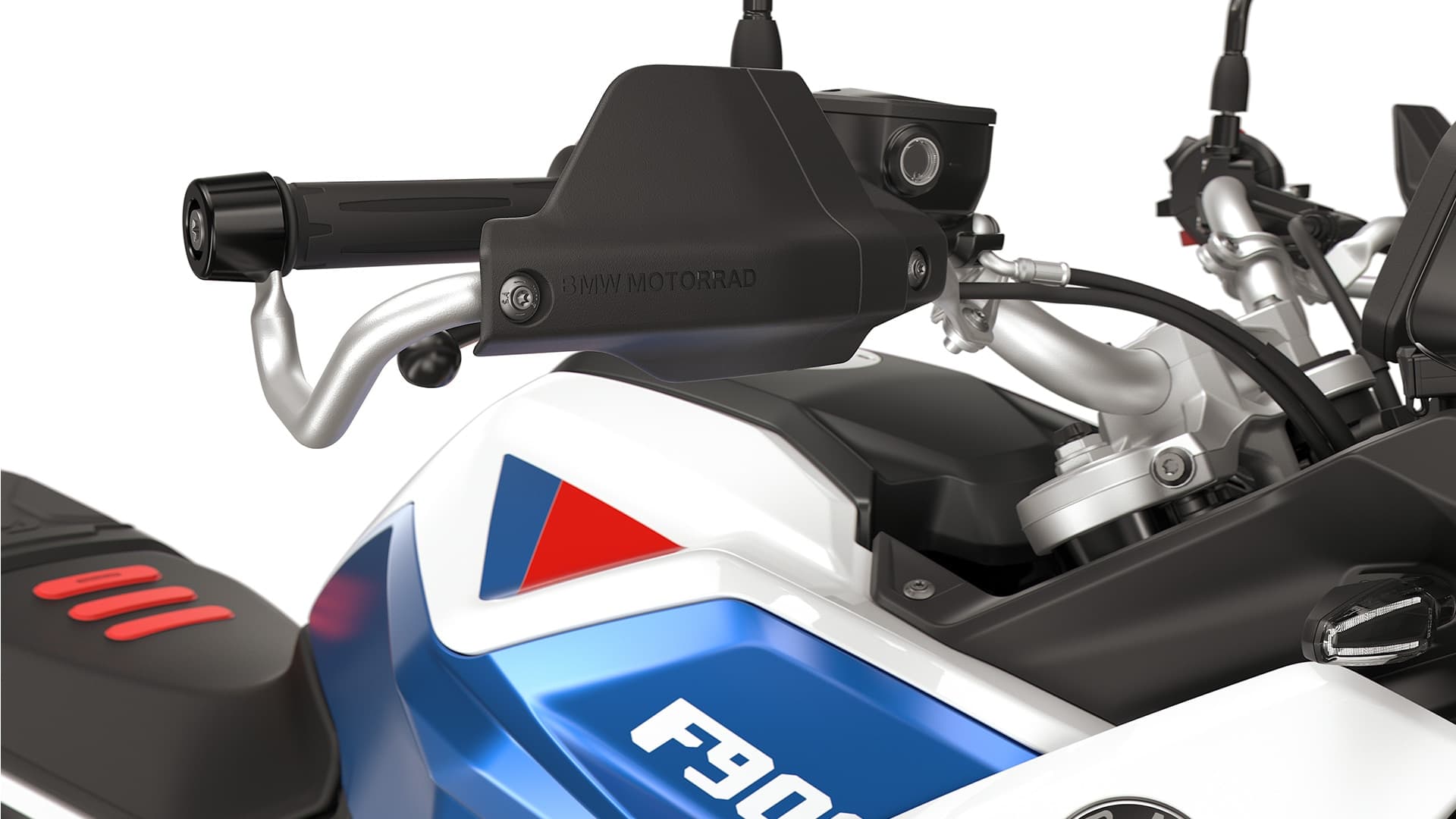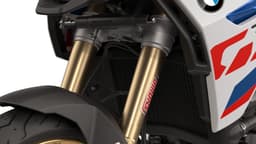 Protección óptima en terrenos complicados: el guardamanos enduro de alta calidad con varillas metálicas y nuevos paneles protectores para la F 900 GS Trophy protege los conjuntos de puños y las manos contra golpes mecánicos y caídas.