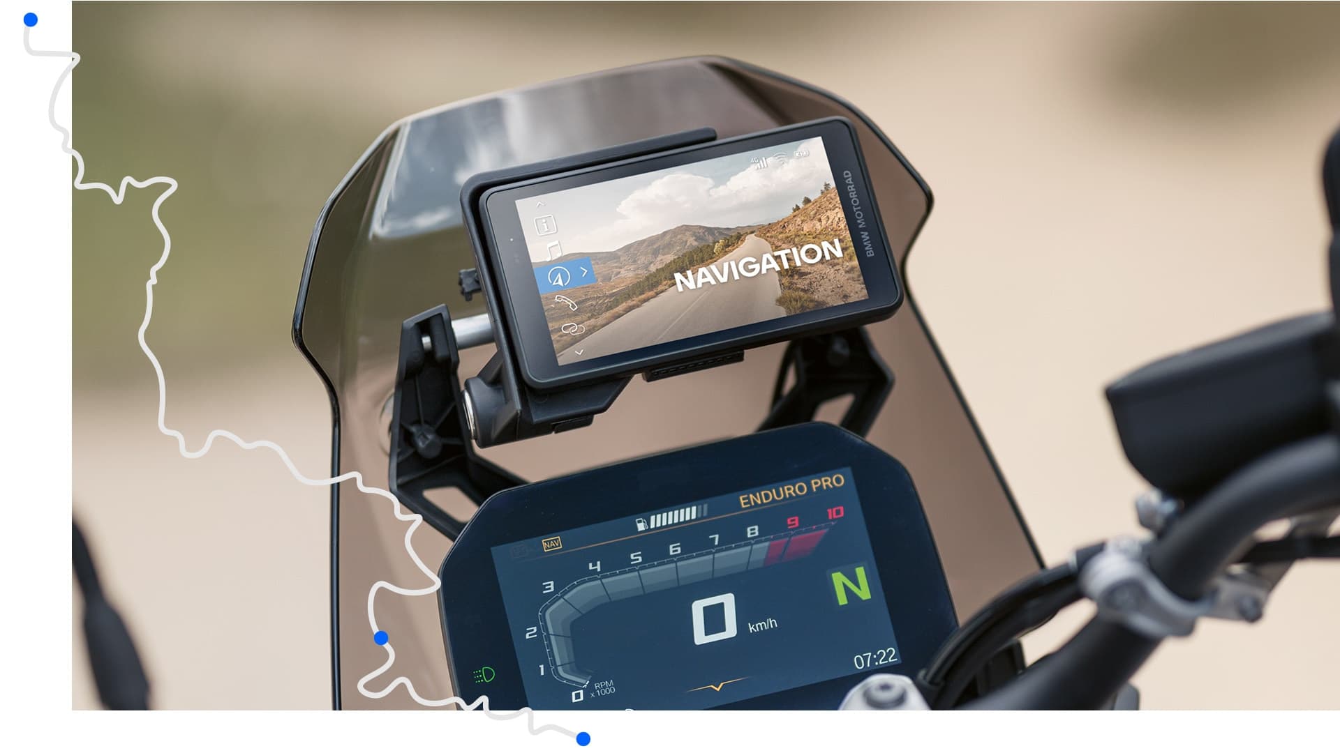 El ConnectedRide Navigator te muestra claramente todo lo que necesitas saber cuando estás en la carretera. Además de información importante sobre el vehículo, te proporciona información actual sobre el tráfico y, gracias a las actualizaciones periódicas de los mapas, puedes estar seguro de que siempre llegarás a tu destino. Su robusto hardware resiste prácticamente todo. Y con la BMW Motorrad Connected App, también podrás integrar el contenido de tu teléfono móvil.