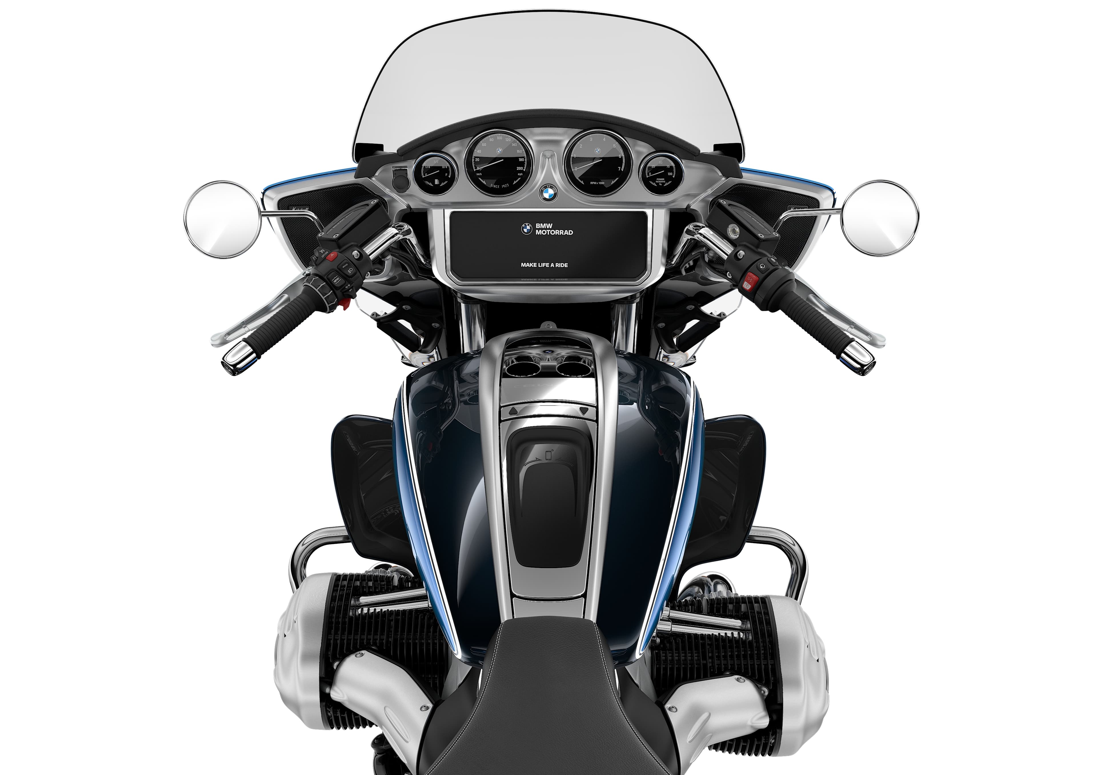 El carenado delantero incorporado en el manillar junto al parabrisas elevado ofrece una protección excelente contra incidencias meteorológicas. Los dos sofisticados faros auxiliares de LED entran en perfecta armonía con la línea del R 18 Transcontinental, lo que le confiere un aspecto distintivo.