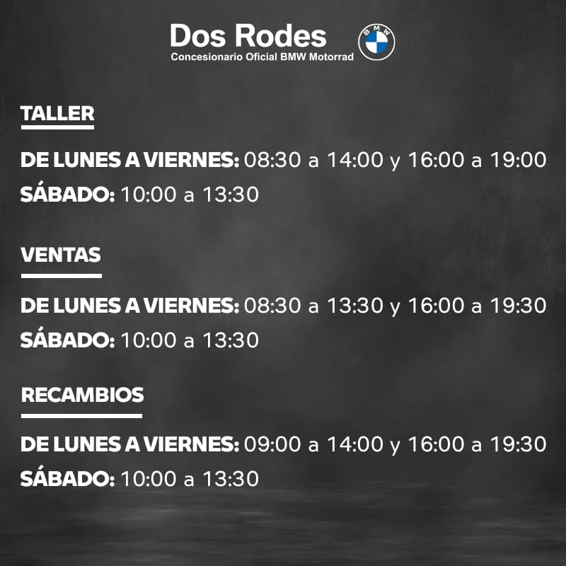 En Dos Rodes llevamos más de 30 años dedicados al mundo de la moto, ofreciendo un servicio cercano, profesional y orientado a la máxima satisfacción del cliente. Desde 1992 somos Concesionario Oficial BMW Motorrad en Valencia, combinando nuestra experiencia con una amplia oferta de motos nuevas, motos de ocasión multimarca y servicios técnicos certificados.